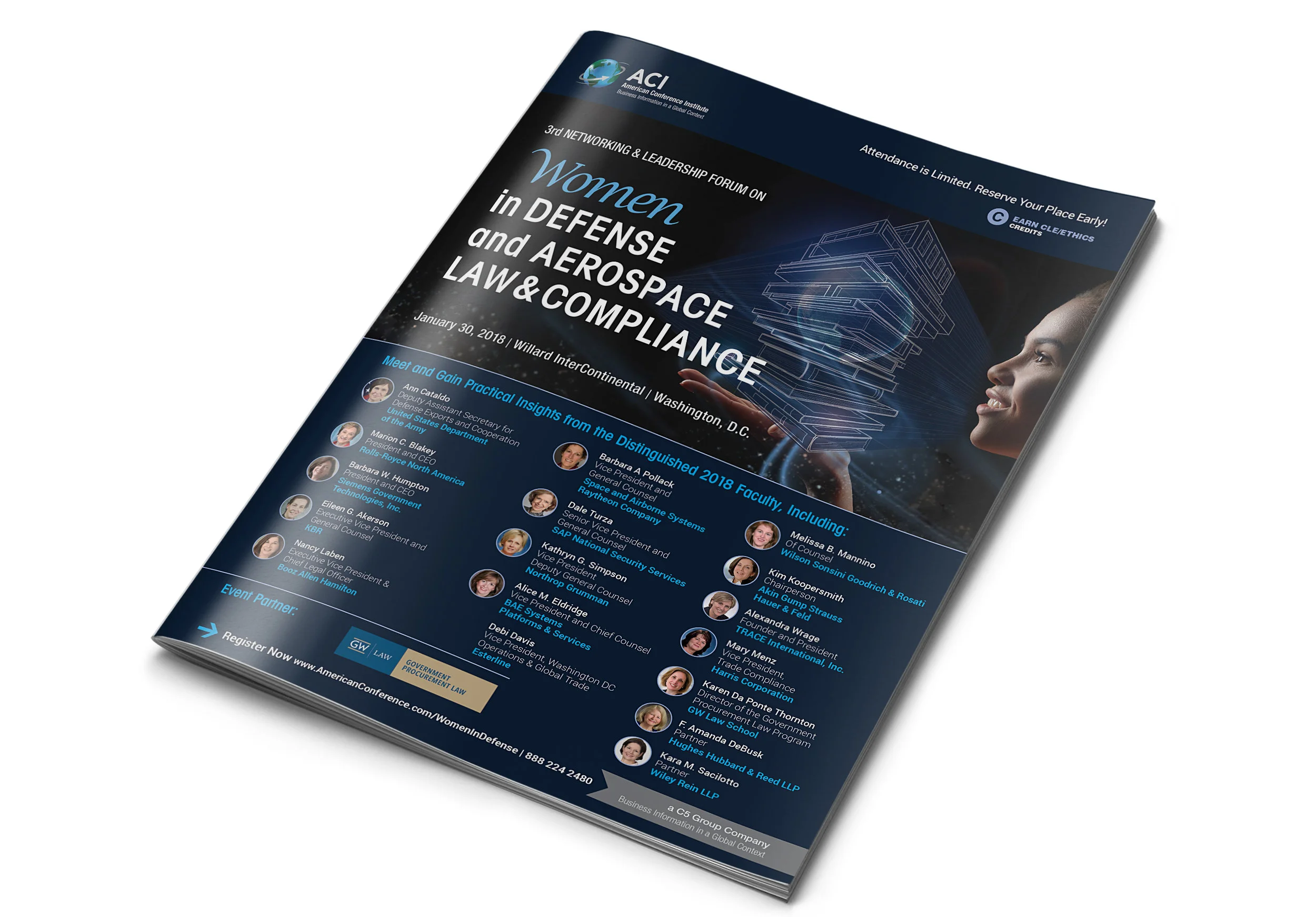 The Women in Defense and Aerospace Law & Compliance is a satellite event in the Women Leaders series. It takes place annually in Washington, DC. As the sole designer for this conference, I came up with a new female-centred look to replace airplane-featured images of the previous years. A darker colour scheme and layered image helped create inspirational visuals to captivate the audience.